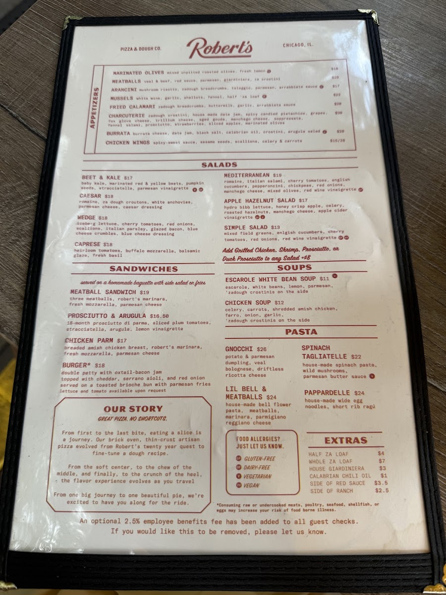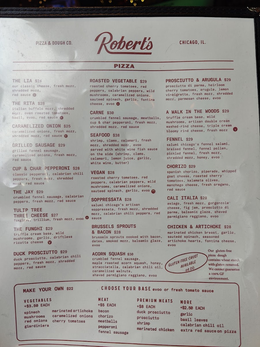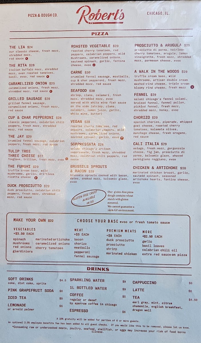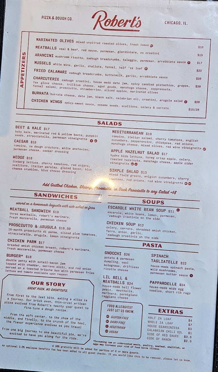 If you're in the mood for an unforgettable dining experience, Robert's Pizza And Dough Company Menu has just what you're looking for. Nestled at 465 N McClurg Ct in Chicago, IL, this gem combines a love for fresh ingredients with a knack for crafting some of the most mouthwatering pizza in town. Whether you're a fan of classic thin crust or craving a hearty deep-dish, their selection offers something to satisfy every taste. Beyond the pizza, expect a variety of hand-tossed dough creations, including delicious pastas and savory sides, all made with a commitment to quality and flavor. With a laid-back vibe and friendly service, dining here feels like a casual celebration of great food. Take a peek at their menu, and you'll quickly find why it's a local favorite.