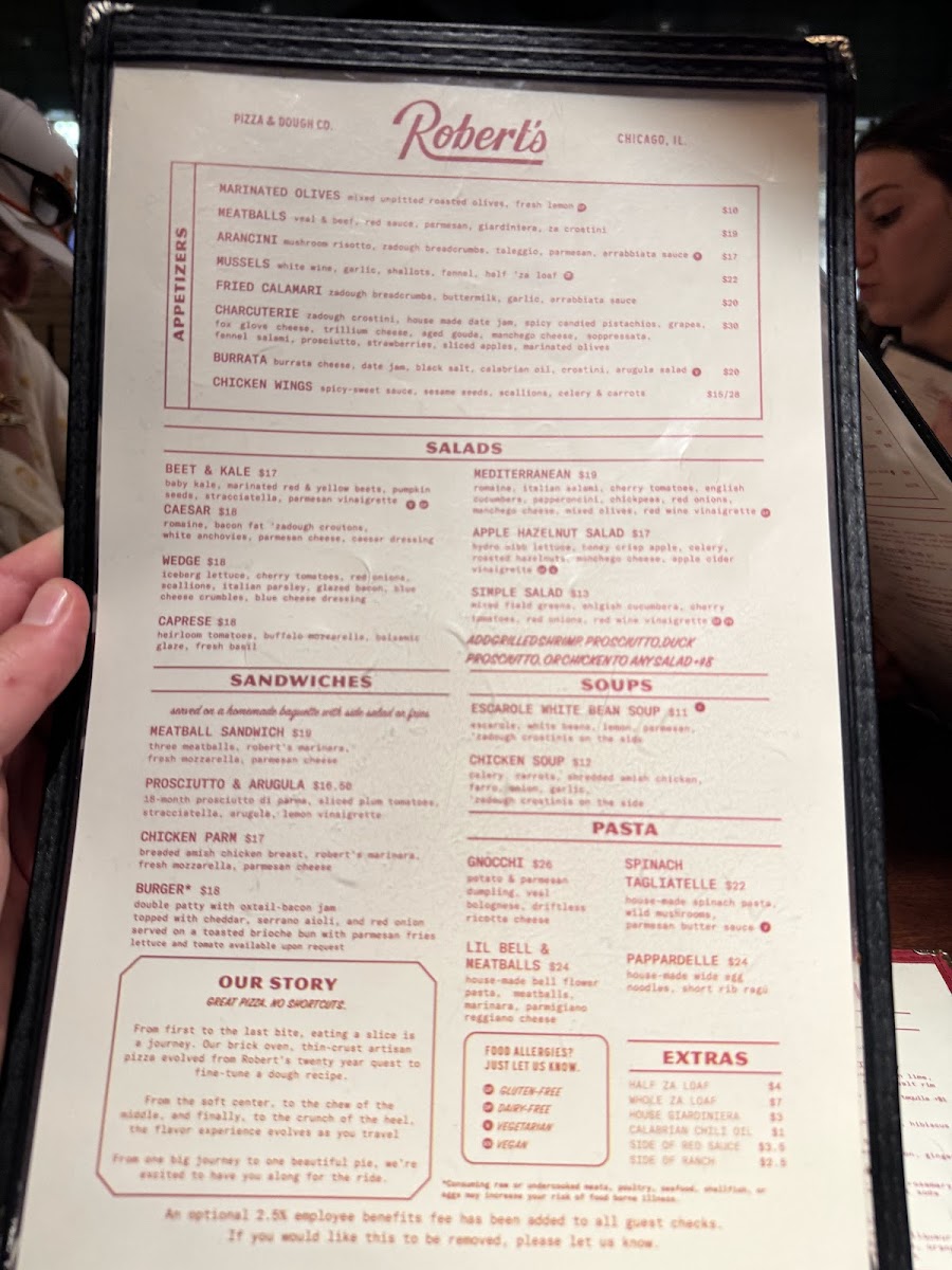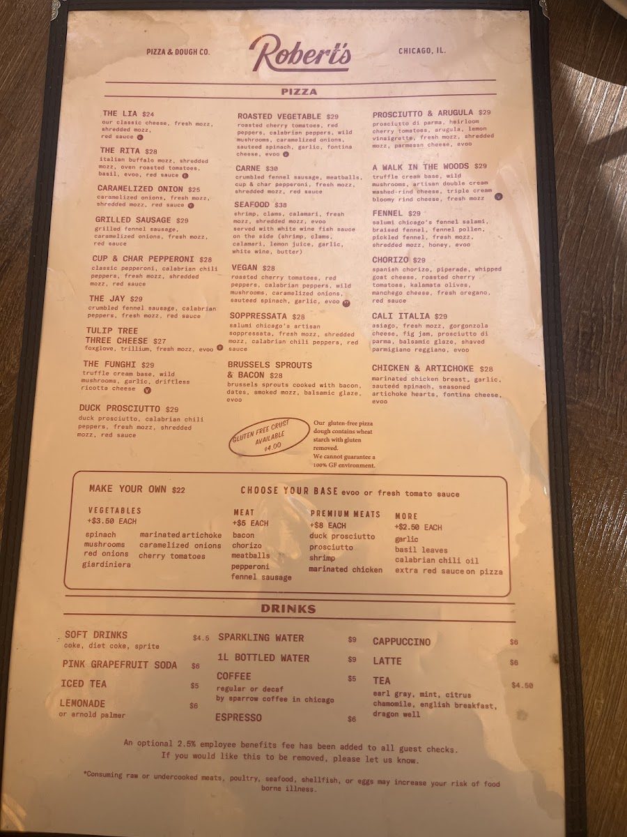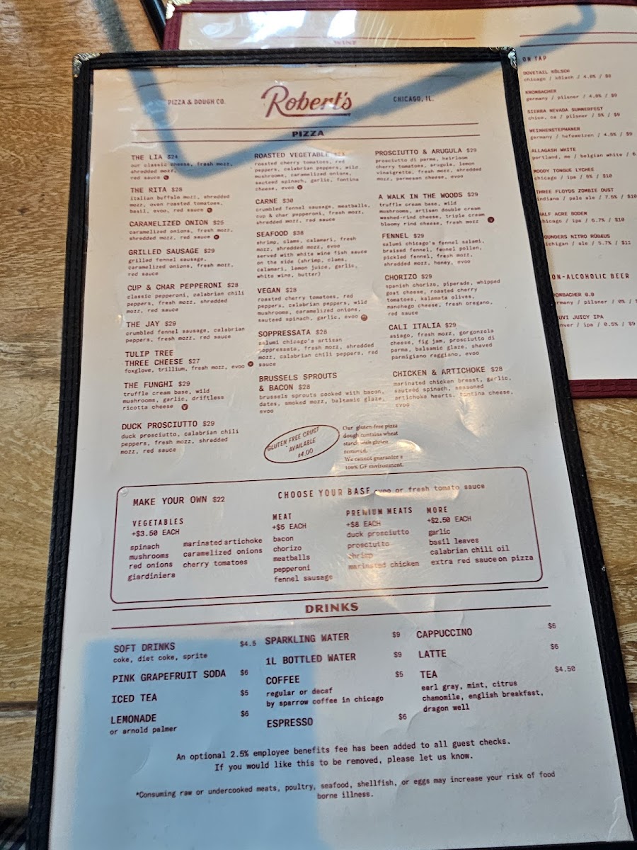If you're in the mood for an unforgettable dining experience, Robert's Pizza And Dough Company Menu has just what you're looking for. Nestled at 465 N McClurg Ct in Chicago, IL, this gem combines a love for fresh ingredients with a knack for crafting some of the most mouthwatering pizza in town. Whether you're a fan of classic thin crust or craving a hearty deep-dish, their selection offers something to satisfy every taste. Beyond the pizza, expect a variety of hand-tossed dough creations, including delicious pastas and savory sides, all made with a commitment to quality and flavor. With a laid-back vibe and friendly service, dining here feels like a casual celebration of great food. Take a peek at their menu, and you'll quickly find why it's a local favorite.